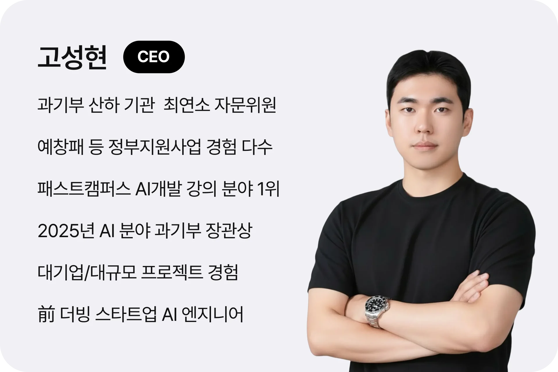 이미 롯데월드, 코람코, 풍인무역과 같은 대기업/중견기업들의 프로그램을 개발해왔고, 저는 다양한 스타트업에서 PM과 AI 엔지니어 출신이자 현재는 이노베이션아카데미(과기부 산하 재단) 최연소 자문위원으로도 활동하고 있습니다.