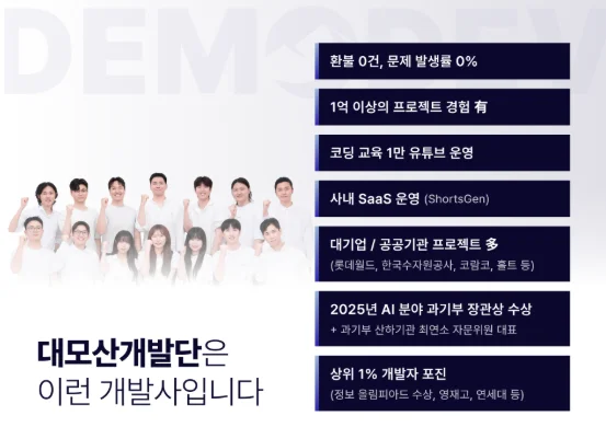 이런 어려운 프로젝트를 할 수 있는 이유는 연세대, 영재고, 정보올림피아드 출신 개발자들로 구성된 상위 1% 개발팀이 직접 프로젝트에 투입되기 때문입니다. 하청에 하청을 주는 구조가 아닙니다. 실력이 검증된 사람들이 처음부터 끝까지 코드를 작성합니다.