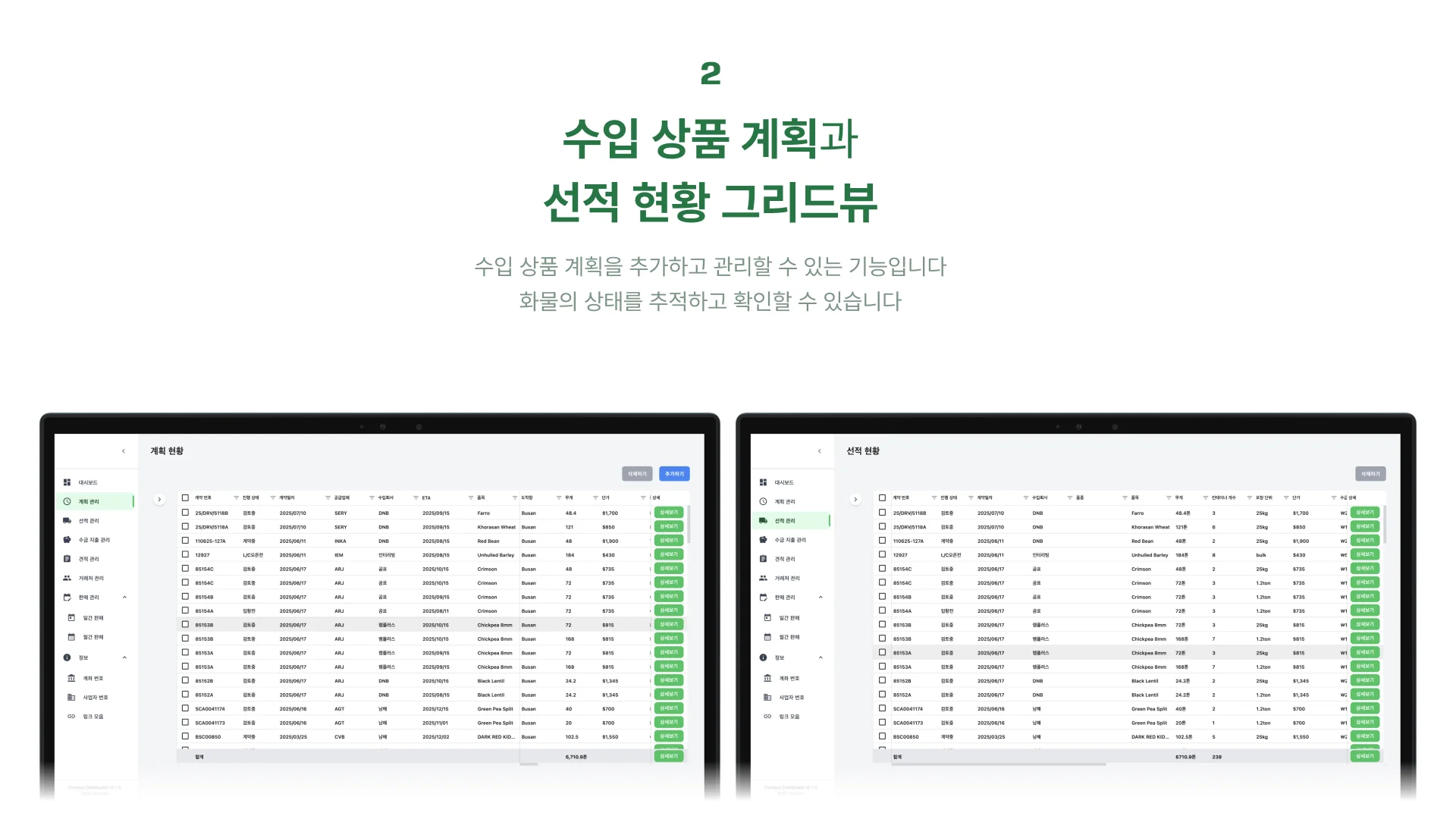 수입 상품 현황을 그리드 뷰로 한눈에 파악할 수 있도록 구성했습니다. 이전에는 각자의 엑셀을 열어봐야 알 수 있던 정보가, 이제는 누구나 로그인만 하면 실시간으로 확인 가능합니다.