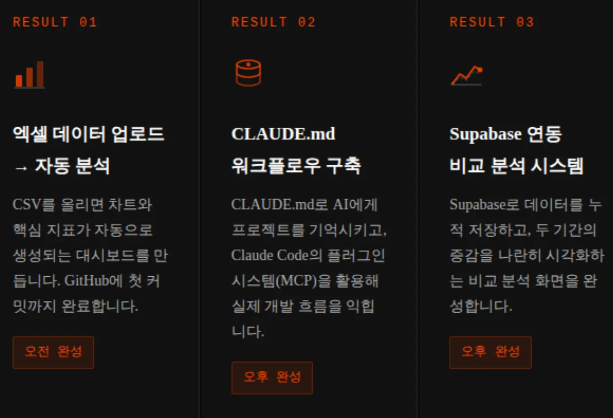 대모산개발단 CAIO가 진행하는 이번 AI 바이브코딩 강의는 Claude Code를 활용한 실무 대시보드 제작과 업무 자동화를 핵심으로 합니다. 수강생은 강의 당일, 직접 동작하는 시스템을 완성해 가져갑니다.