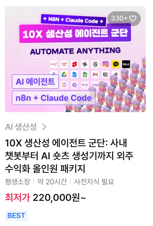 10X 생산성 에이전트 군단 강의를 통해 n8n, Claude Code 등을 활용해 실제 납품 가능한 수준의 자동화 에이전트를 구축하는 과정을 다룹니다.