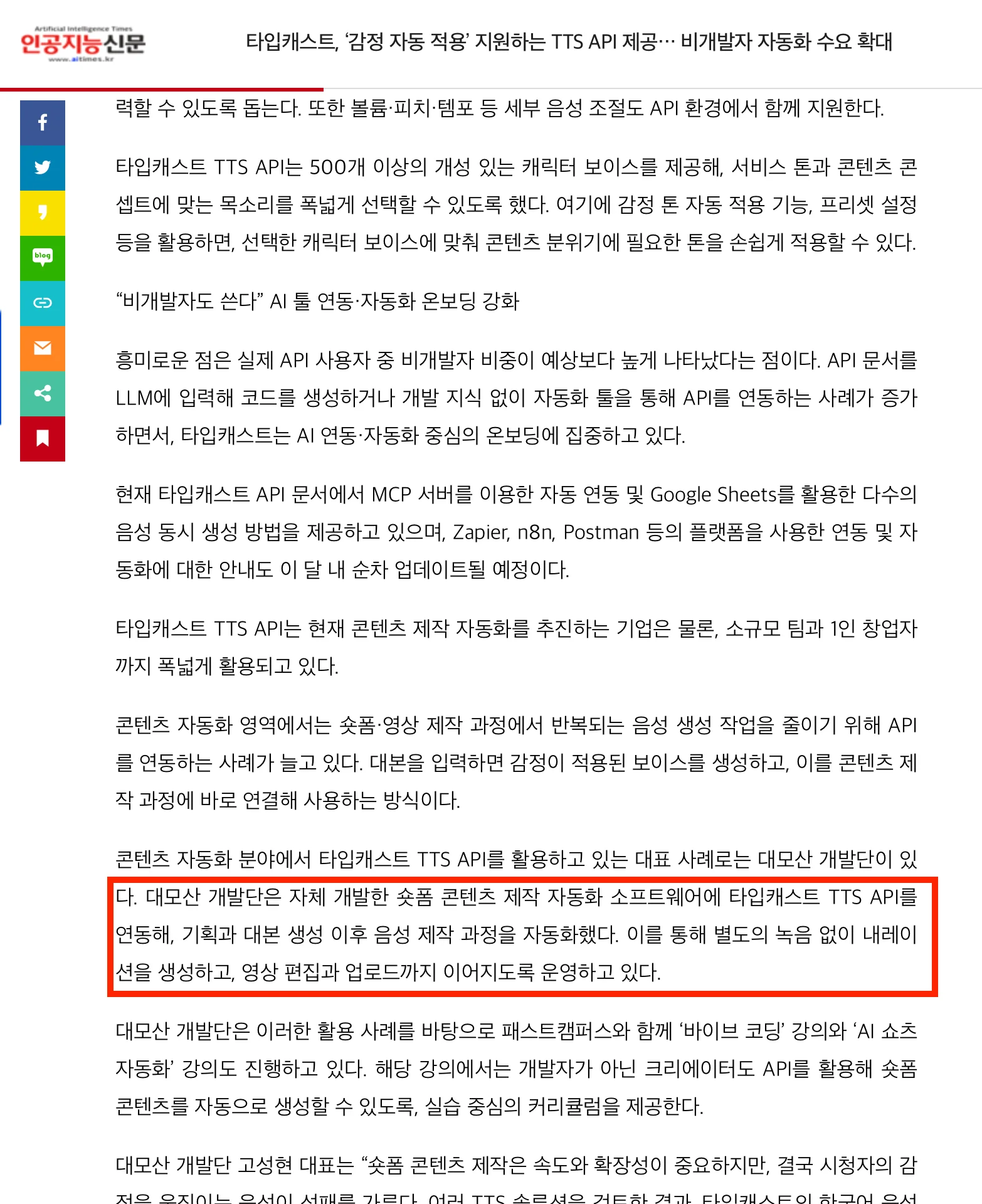 AI 전문 미디어 인공지능신문에서 숏폼 콘텐츠 제작 자동화 소프트웨어에 타입캐스트 TTS API를 연동하여 실습 중심의 커리큘럼으로 소개됐습니다.