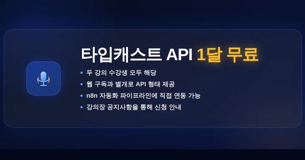 웹 구독과 별개로 API 형태로 제공되며, n8n 등 자동화 파이프라인에 직접 연동해 사용할 수 있습니다. 신청 방법은 강의장 내 공지사항을 통해 안내됩니다.