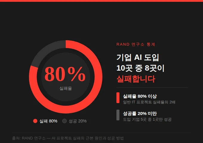 RAND 연구소 조사에 따르면 기업 AI 도입 성공률은 20%에 미치지 못합니다. 수개월간 기획하고 예산을 투입했음에도 실제 업무에 정착하지 못하는 사례가 대부분입니다.