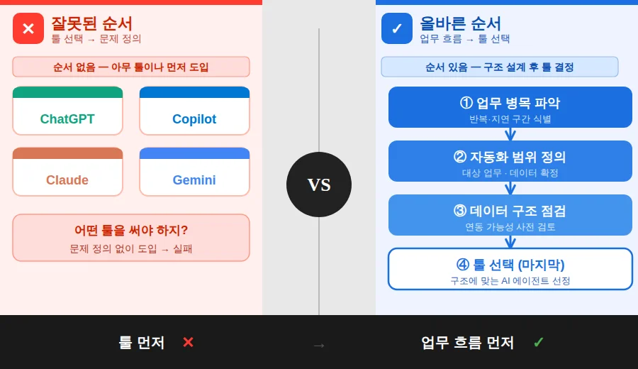RAND 연구소가 밝힌 도입 실패 원인 1위는 '해결할 문제를 잘못 정의하는 것'이었습니다. 업무 흐름 분석 없이 도구를 먼저 선택하면, 아무리 뛰어난 에이전트도 현장에서 활용되지 않습니다.
