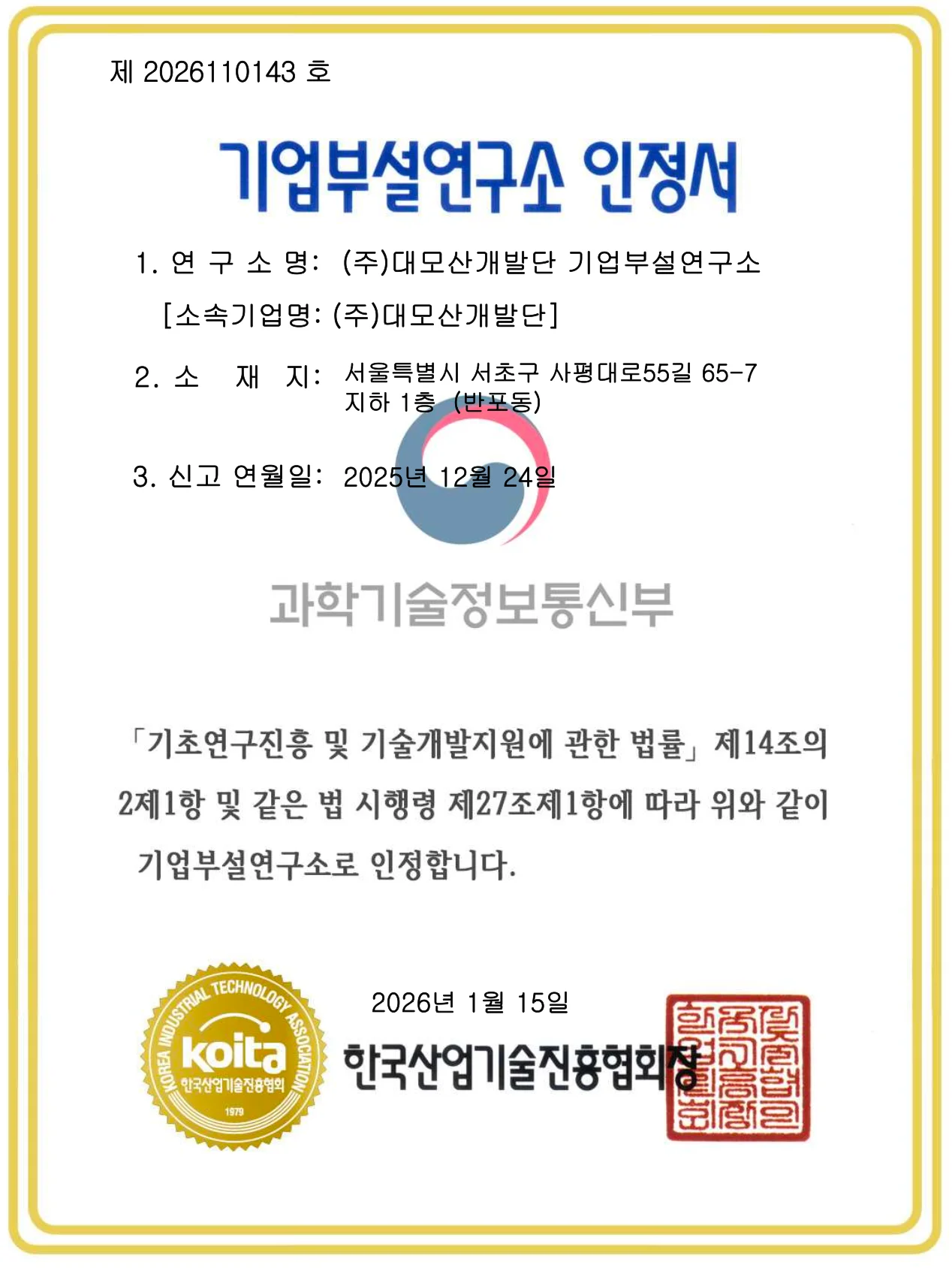 그리고 이 기술력을 더 강화하기 위해 '기업부설연구소'까지 설립을 완료했습니다.