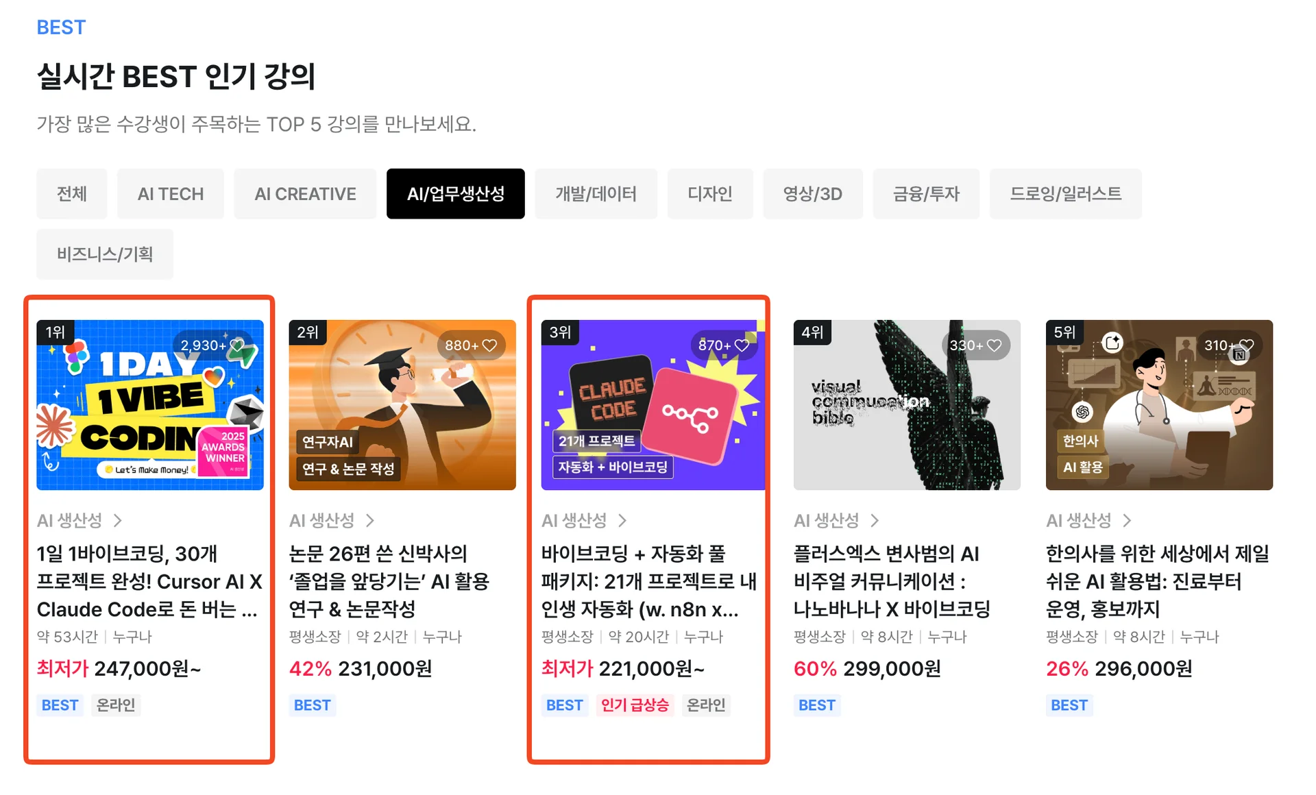 또한 국내 최대 온라인 교육 플랫폼 패스트캠퍼스에서 AX, AI 자동화 분야 1위를 기록하고 있습니다. 수많은 수강생분들이 저희 교육을 통해 AI 자동화를 배우고 계십니다.