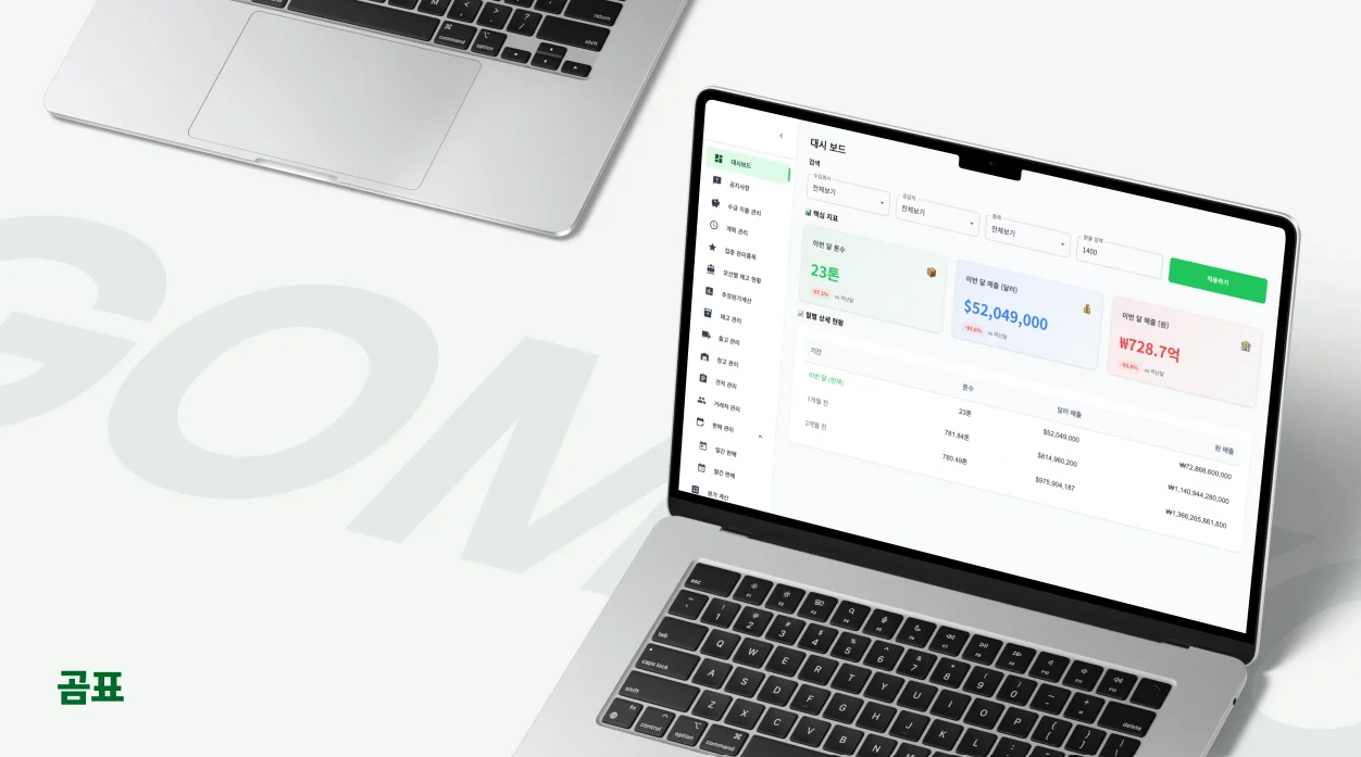 무역 계획 전 과정을 구글시트로 관리하던 곰표는 수입, 출고, 재고, 정산 데이터가 파일마다 분산돼 있었고, 보고서는 매번 수작업으로 작성해야 했습니다.