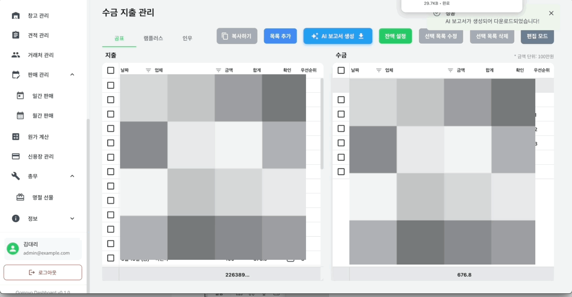 수금과 지출 내역을 한 페이지에서 확인할 수 있게 만든 건 기본이고, 여기서 한 발 더 나갔습니다. 전년도, 올해, 이번 달, 지난달 데이터를 AI가 자동으로 분석해서 지출 패턴 보고서를 작성해줍니다.